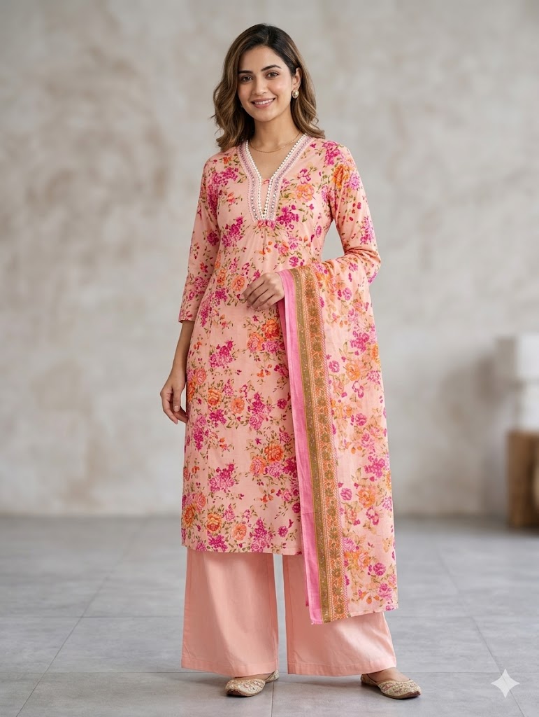Peach Floral Print Cotton Kurta & Wide-Leg Palazzo Set