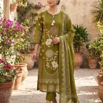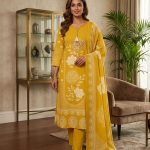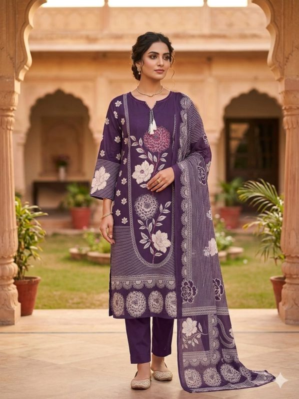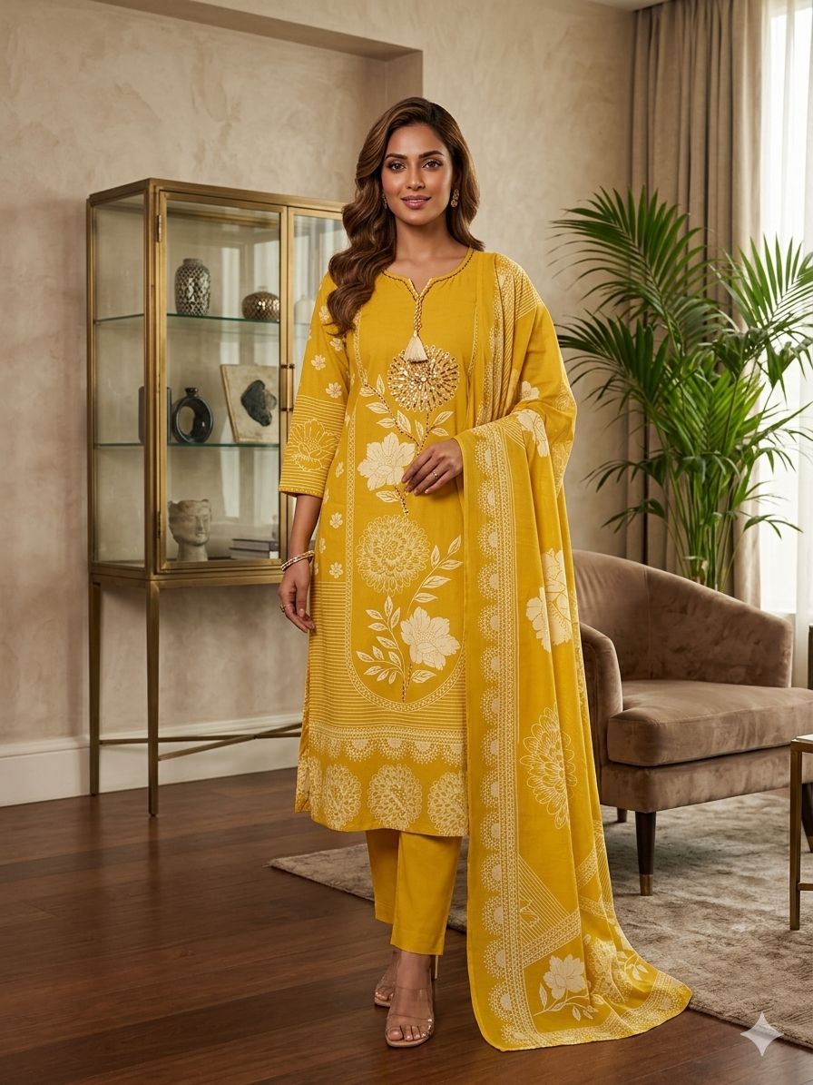 Design & Silhouette: Elegant A-line straight-cut kurta paired with matching slim-fit trousers and a coordinated dupatta.