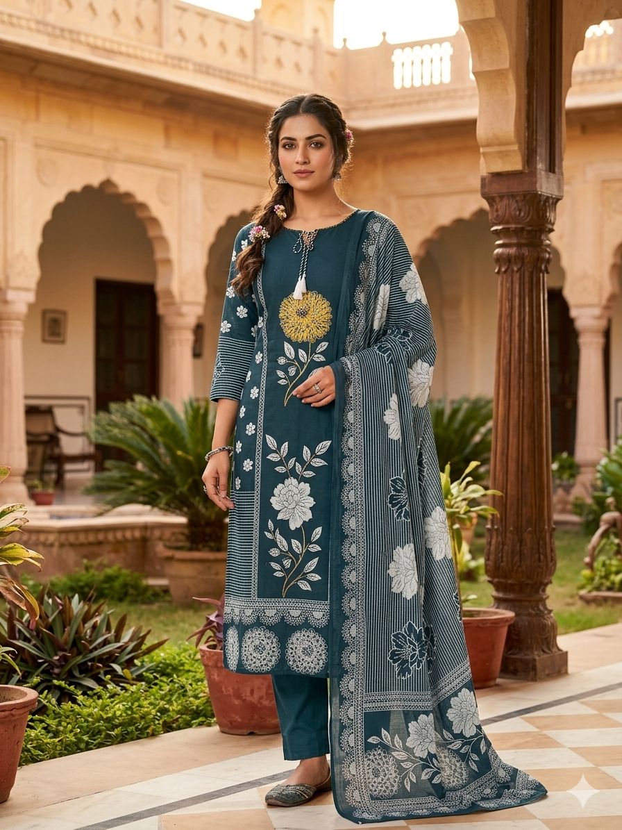 Dupatta: Lightweight, full-length matching dupatta with a contrast striped border and large floral corner prints.