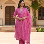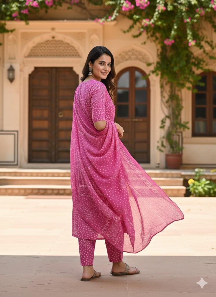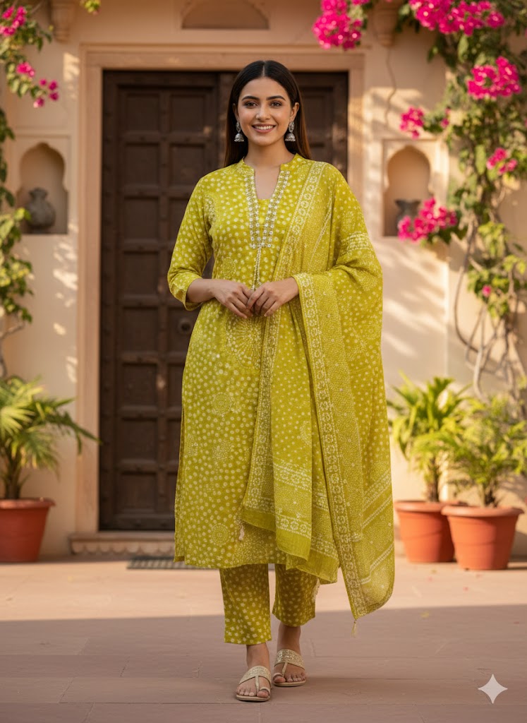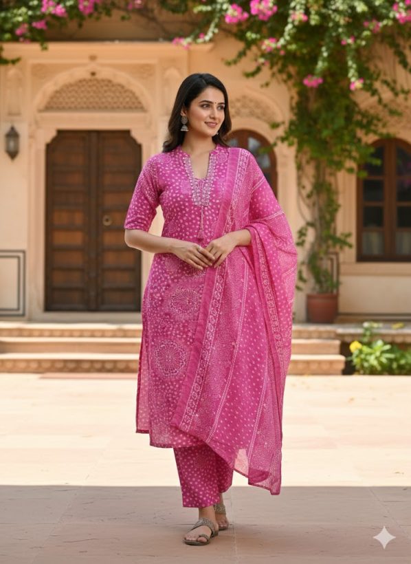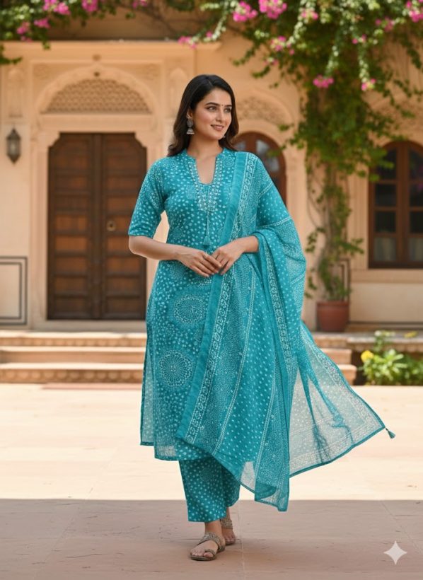 Design & Style: A classic three-piece ethnic set featuring an A-line kurta, matching straight-fit trousers, and a lightweight coordinated dupatta.