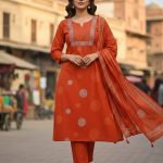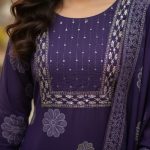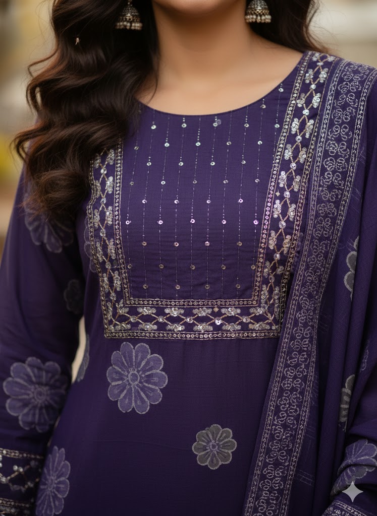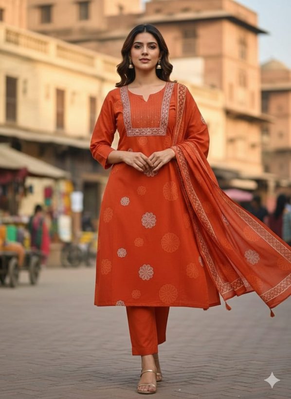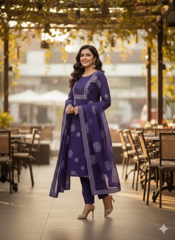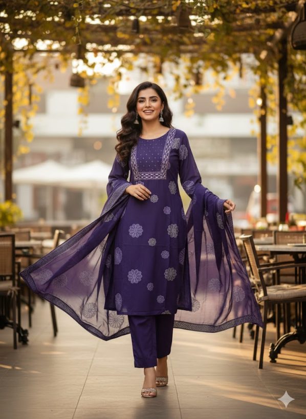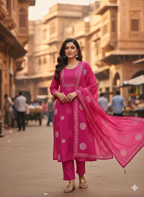 Design & Silhouette: A classic 3-piece ethnic ensemble featuring a straight-fit long kurta, matching slim-fit trousers, and a coordinated dupatta.