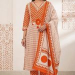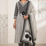 Dupatta: Lightweight fabric with bold geometric borders and circle motifs.