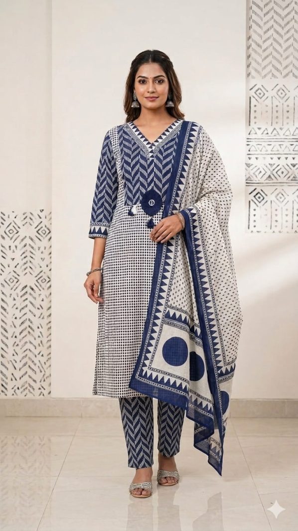 Set Includes: Straight Kurta, Slim-fit Trousers, and Printed Dupatta.