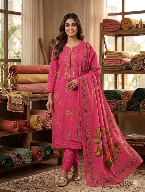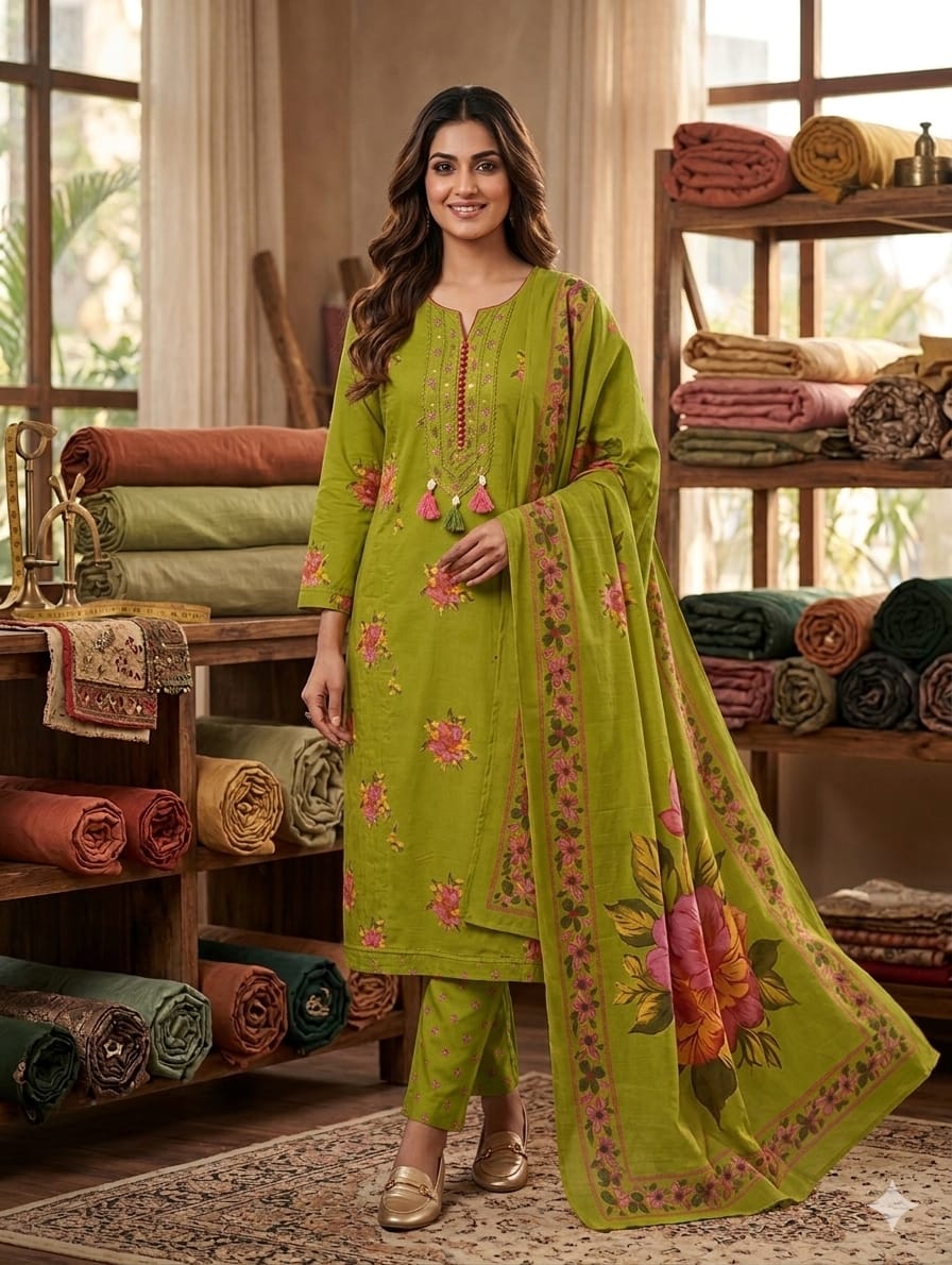Coordinated Three-Piece Set: Includes a straight-fit kurta, matching slim-tapered trousers, and a sweeping dupatta with a bold, oversized floral border.