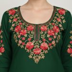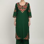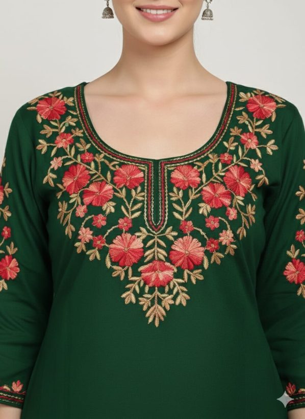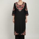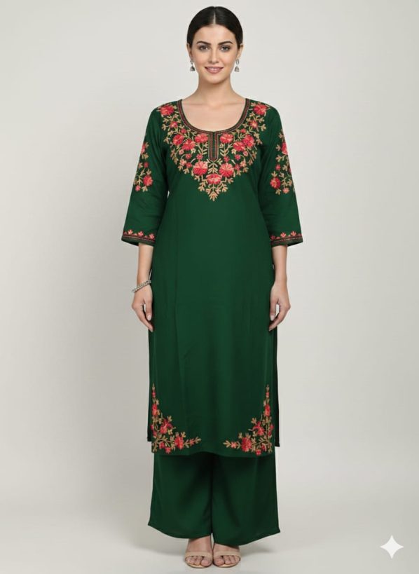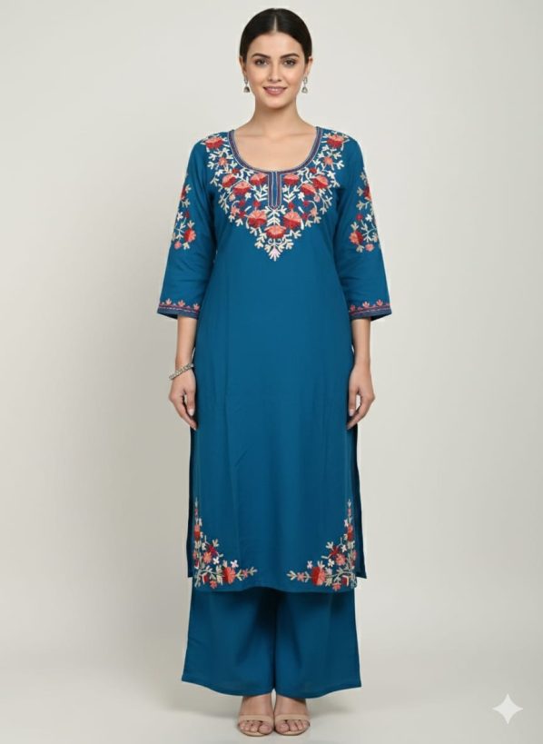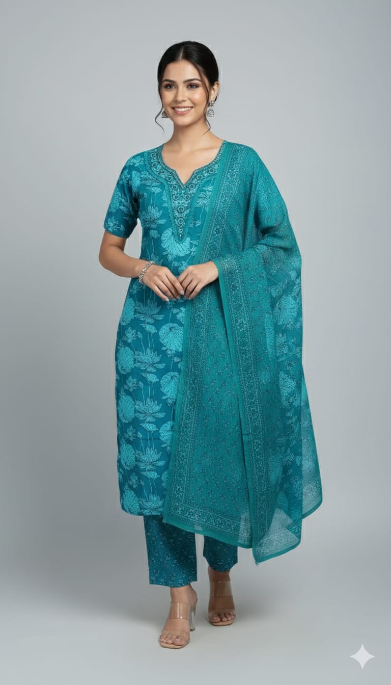 Top (Kurta): A straight-cut silhouette in premium fabric, featuring a deep round neckline with a split V-notch and 3/4 sleeves.