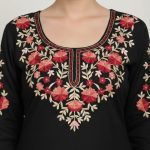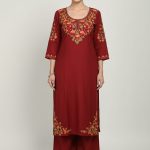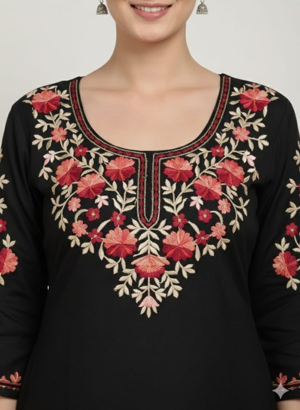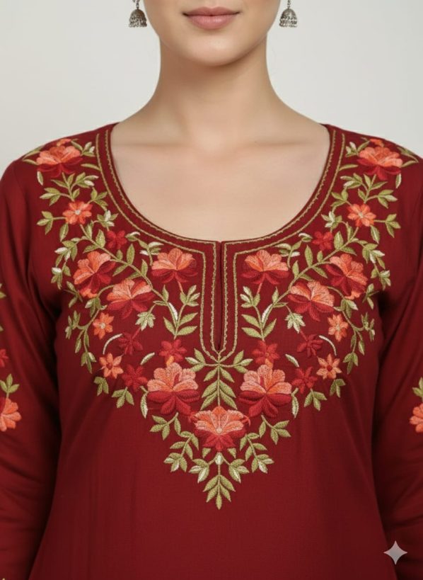 Embroidery: High-density floral threadwork in shades of peach and crimson adorns the neckline, sleeve cuffs, and side slits.