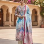 Design & Print: Features an intricate digital paisley and floral print in a vibrant palette of cerulean blue, magenta, and soft cream.