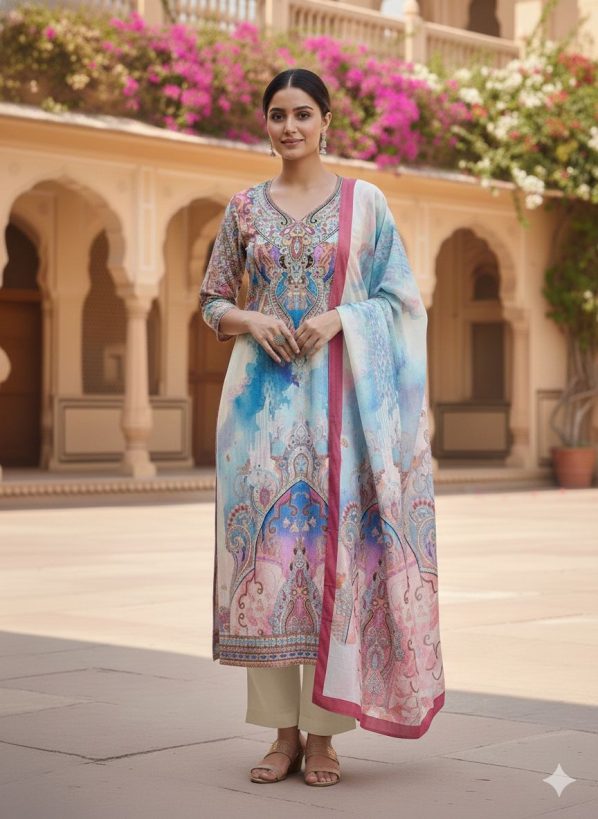 The Dupatta: A coordinating lightweight dupatta with a matching border and watercolor-inspired print transitions.
