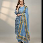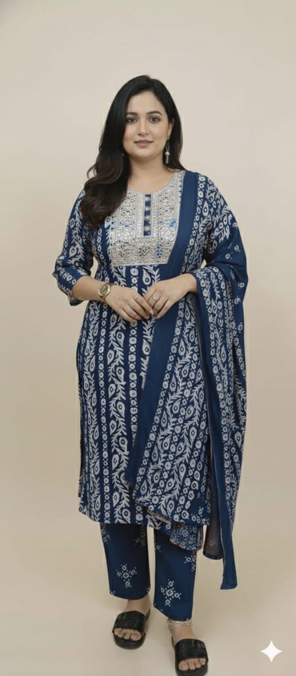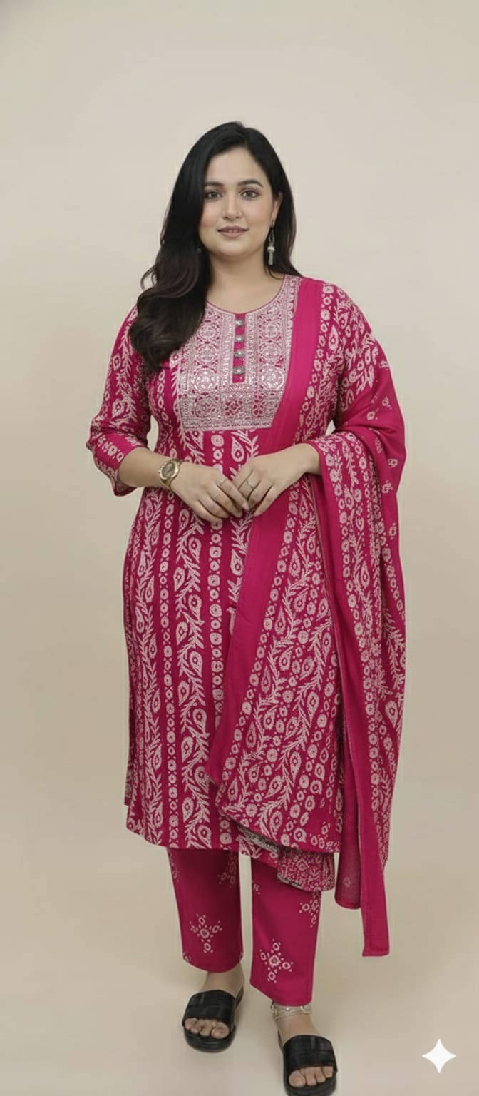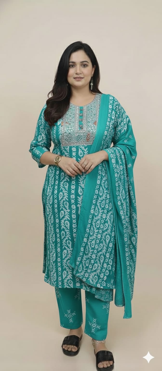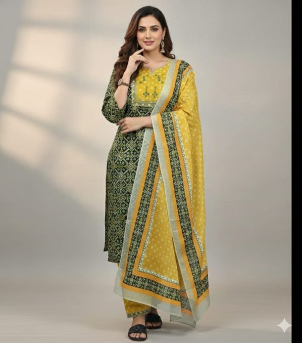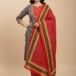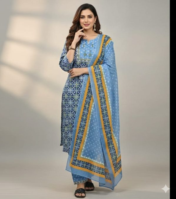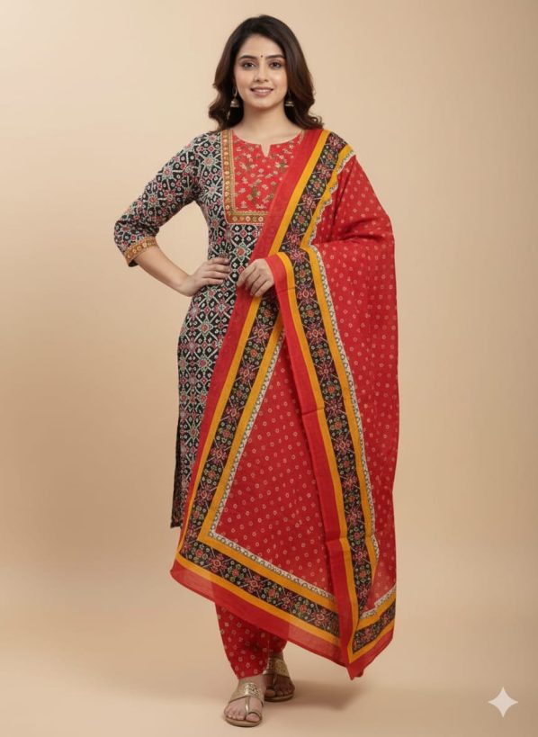 Coordinated Three-Piece Set: Includes a straight-fit kurta, matching printed trousers, and a full-length lightweight dupatta.