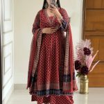 Design & Silhouette: Classic Anarkali flare with a flattering pleated waist and a detailed V-neckline featuring intricate embroidery.