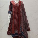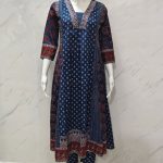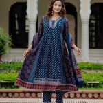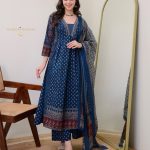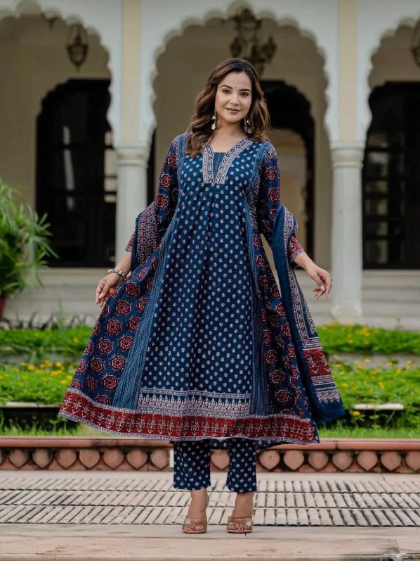 Print Details: A sophisticated mix of Ajrakh-inspired patterns, micro-floral butis, and bold striped borders at the hem.