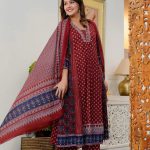 Kurta: Floor-length flared tunic with 3/4 sleeves.