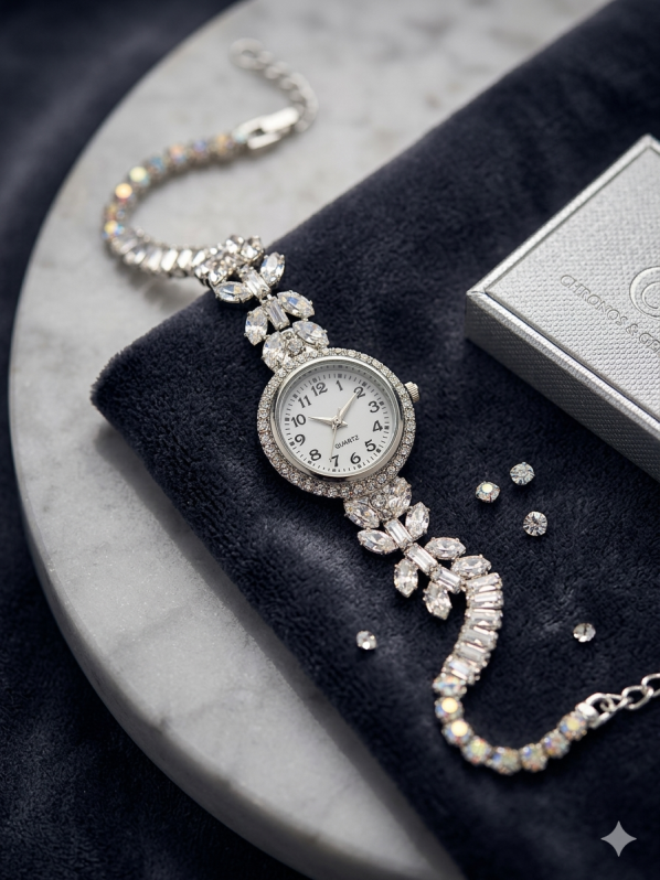 This is an elegant, analog-style women’s bracelet watch, characterized by its intricate jewelry design. The watch is made of white metal (likely silver-toned or stainless steel) and is heavily adorned with high-quality rhinestones and crystals, giving it a luxurious, diamond-like sparkle.