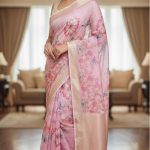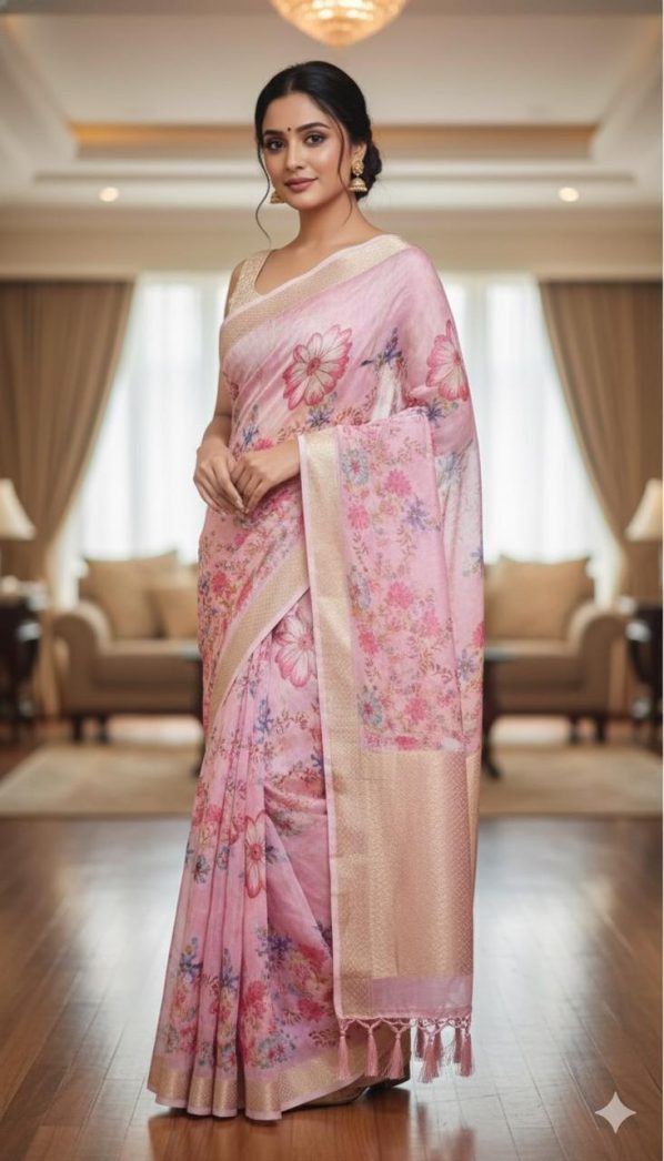 Pink with multicoloured print, Pure/Art Silk, Elegant golden zari border, Festive wear, party wear, or wedding events, Pair with a gold blouse and statement earrings for a timeless look