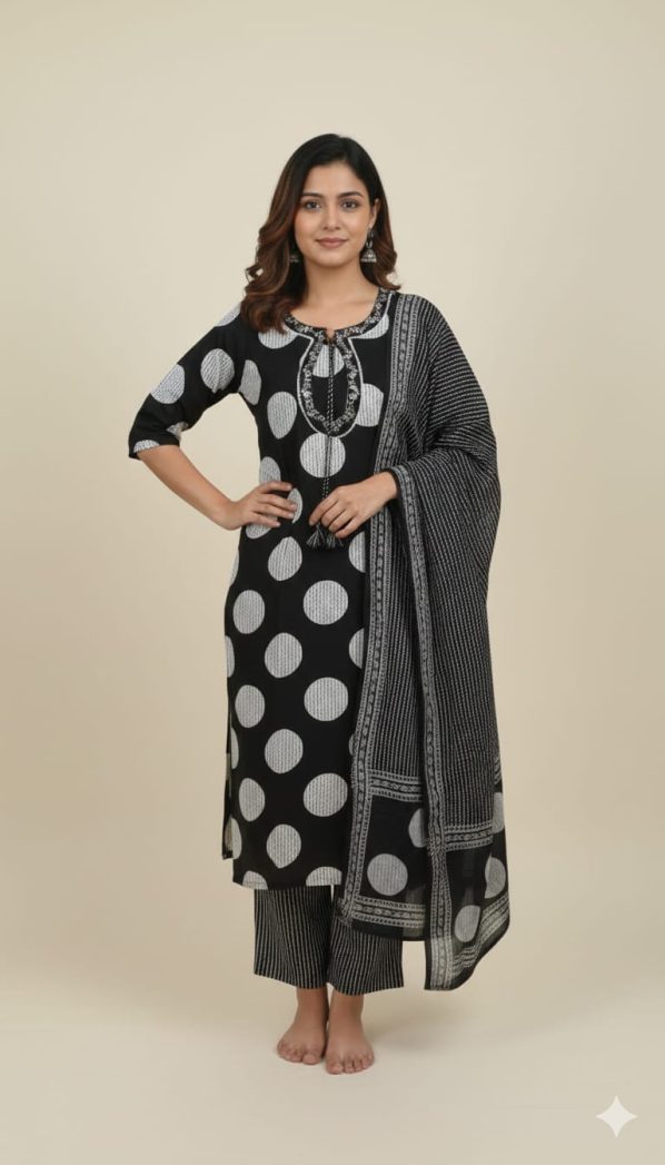 Kurta Style: Straight-fit calf-length kurta featuring oversized white polka dots.