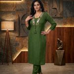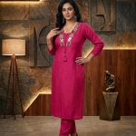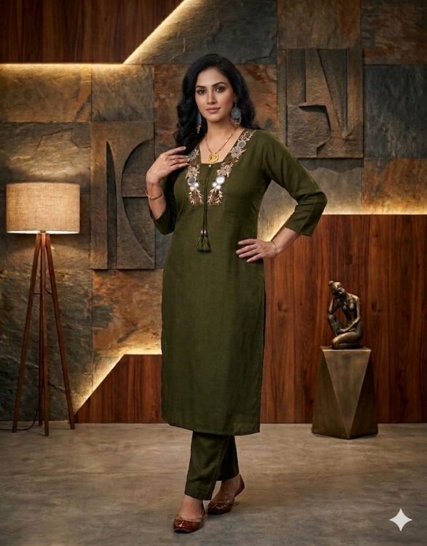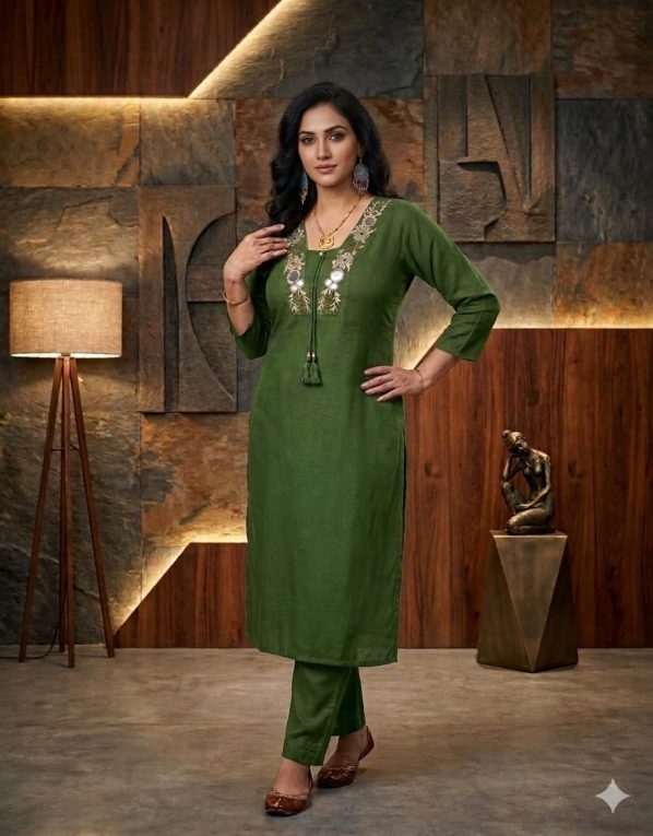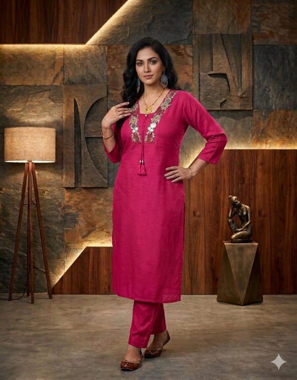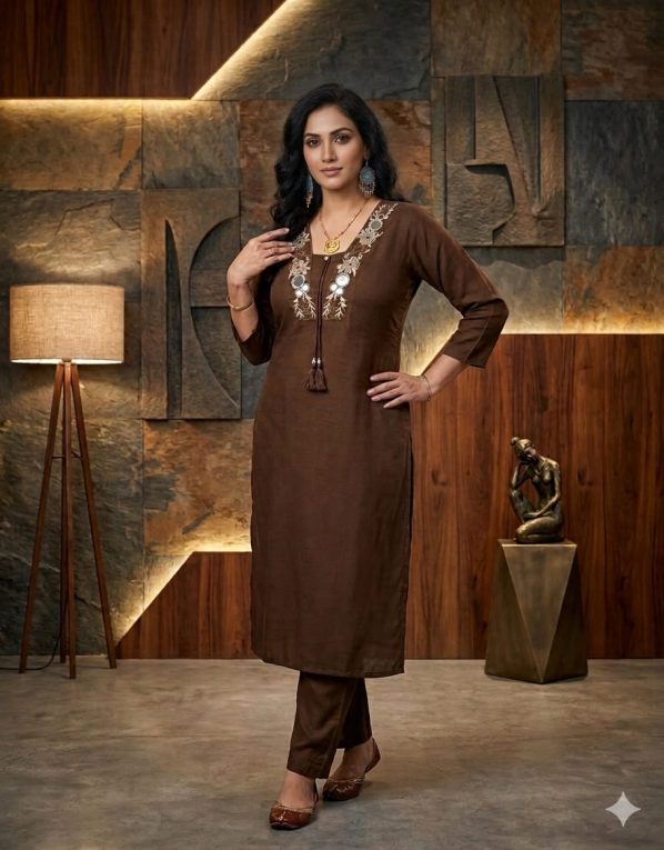 Sleek Silhouette: Includes a straight-fit kurta paired with matching narrow-leg trousers for a streamlined, contemporary look.